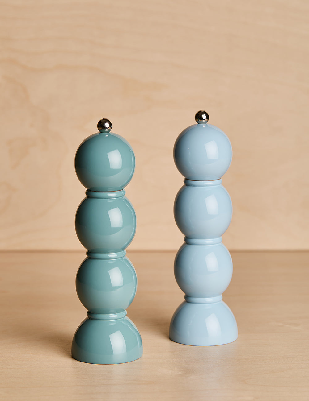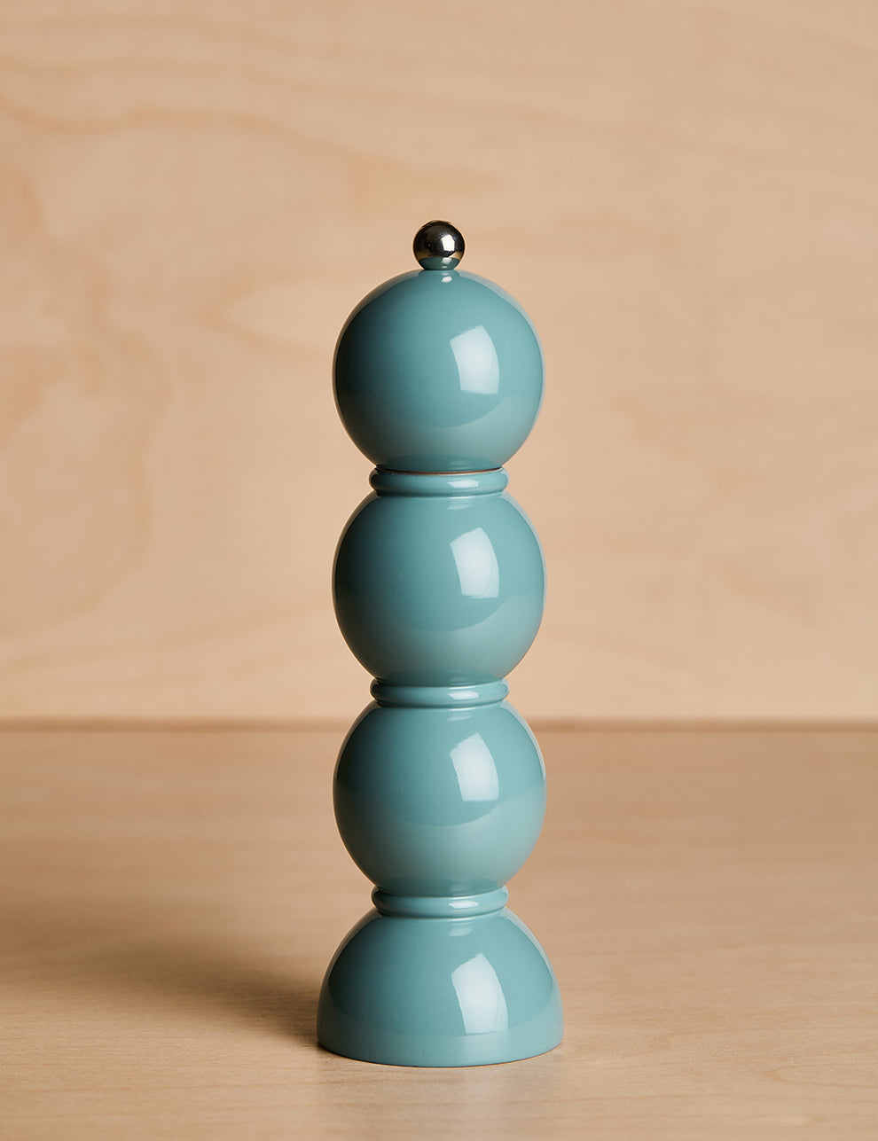 This chambray lacquered bobbin shaped mill comes with both an S and a P stainless steel screw knob so you can decide for yourself whether you want this to be a Salt Grinder or a Pepper Grinder.