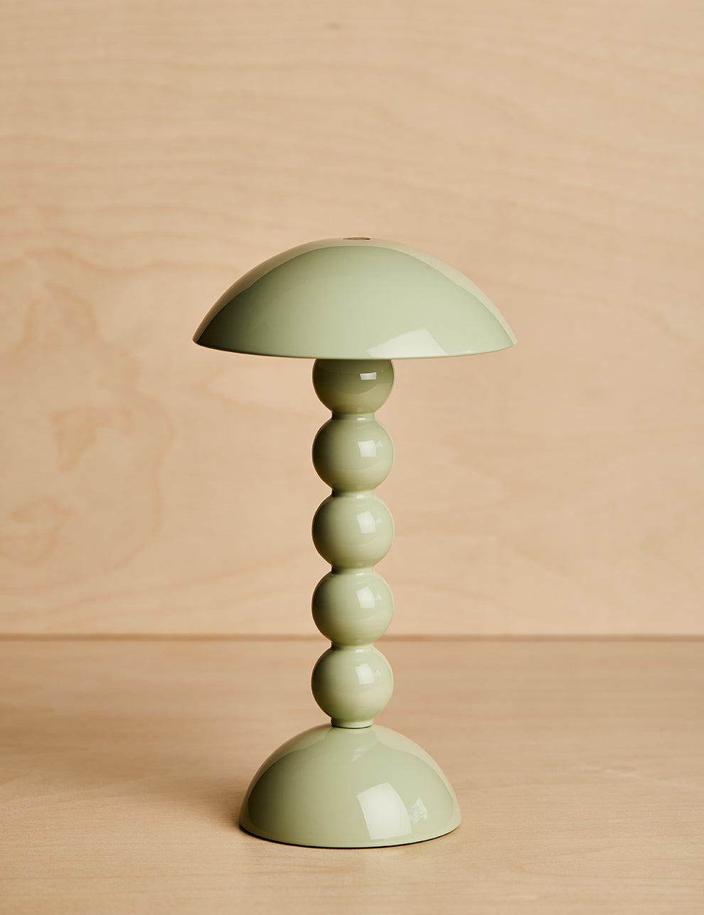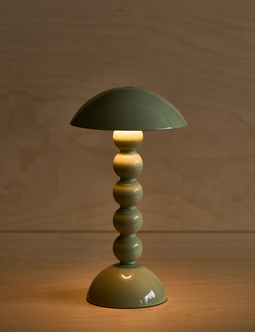 This Sage one-of-a-kind rechargeable lamp features a Bobbin-Shaped design. It offers up to 10 hours of battery life on its brightest setting and has three adjustable light levels.