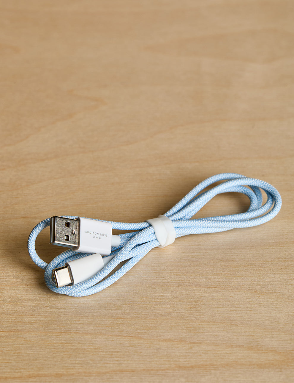 Comes with a USB-USB C charging cable. Tap the button on the top to activate the LED Lamp.
