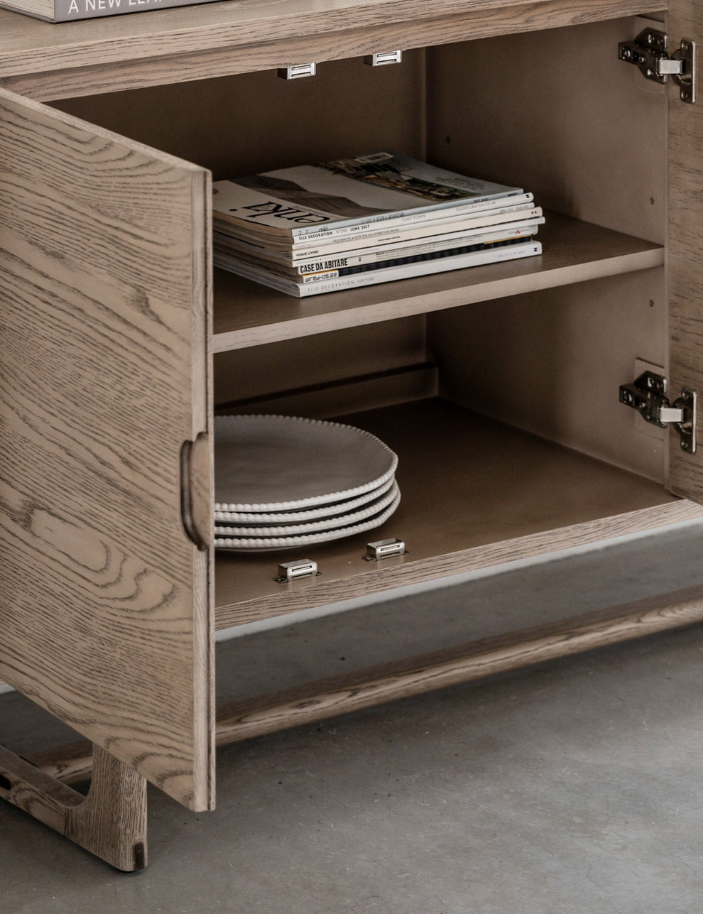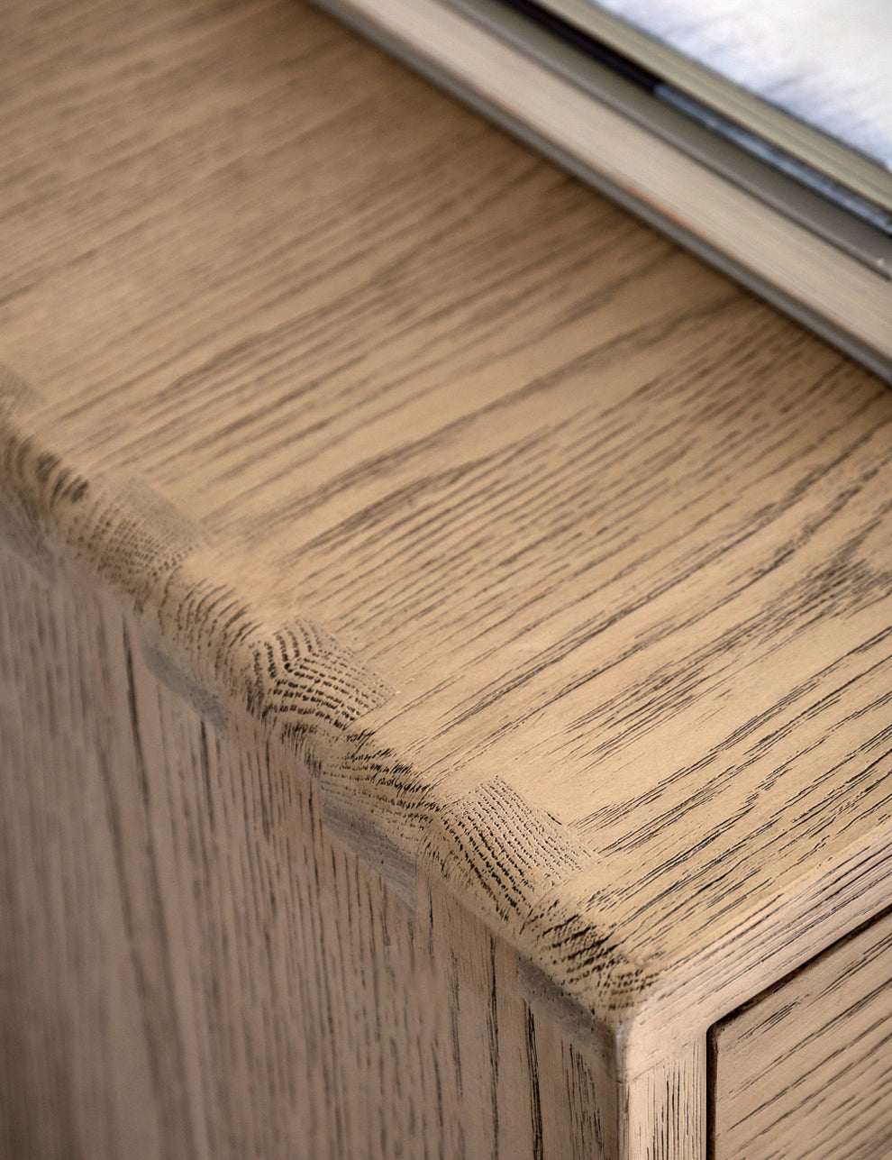 This stylish sideboard is crafted from the finest oak and oak structural veneers where practical, with a smoked finish with brown and grey hues in a nod to the original fuming process that gave oak an aged smoky finish. Finger joints, a technique used on only the finest cabinetry, on the exposed corners give strength and a sense of purpose and tradition to create long-lasting, legacy furniture that can be collected and handed down through generations. Also offered in a natural finish. Matching pieces available.