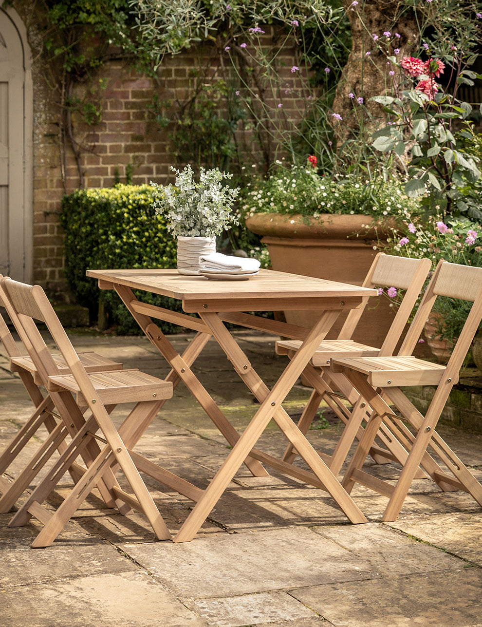 Effortless style meets practicality with our folding dining set. Crafted from durable acacia wood, this elegantly simple set includes a slatted-top dining table and four folding chairs, making it perfect for alfresco meals, garden parties, or flexible outdoor spaces. When not in use, the table and chairs fold away easily for convenient storage or transport, creating a versatile and timeless outdoor dining solution.