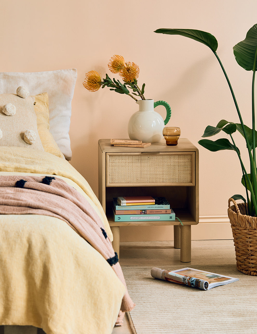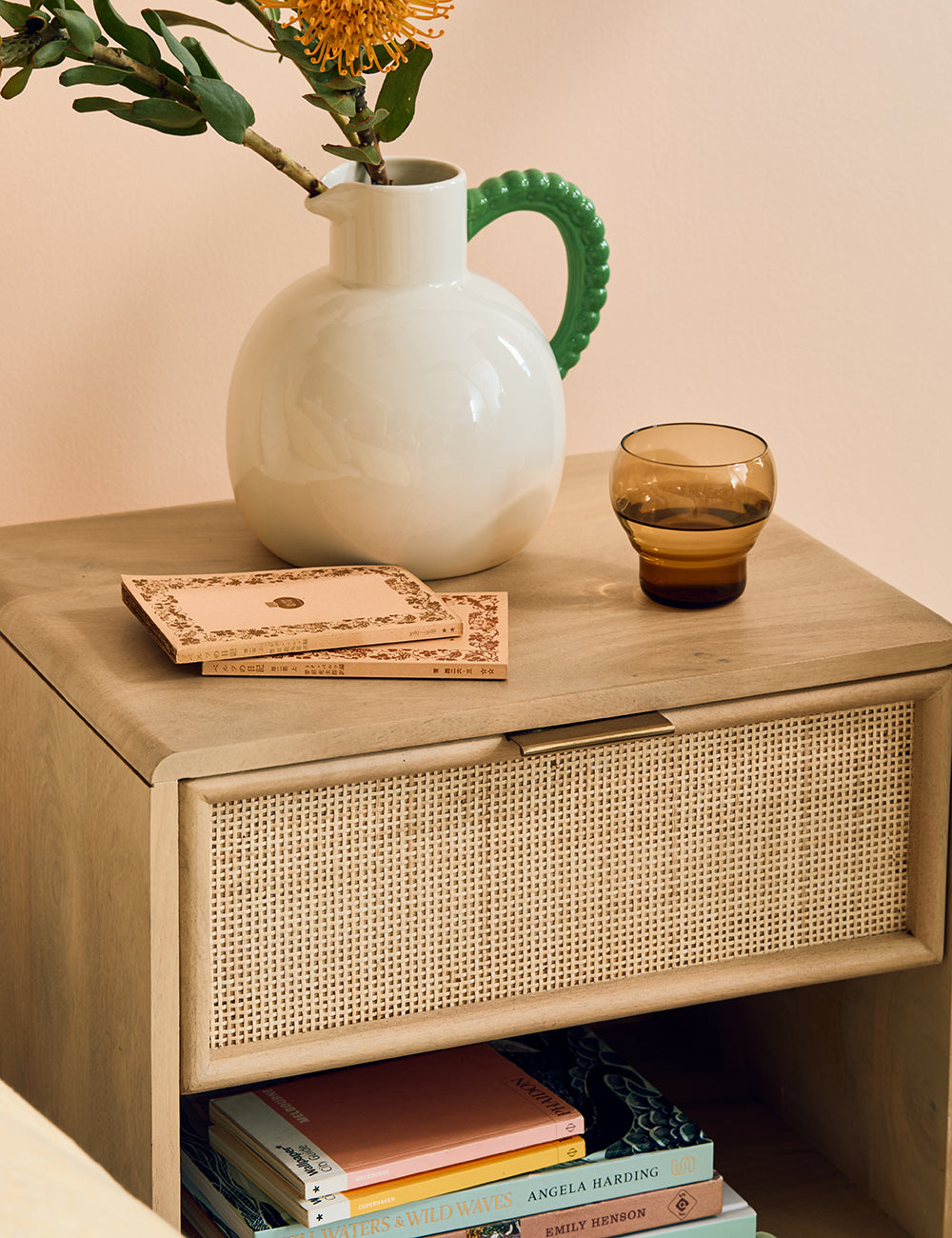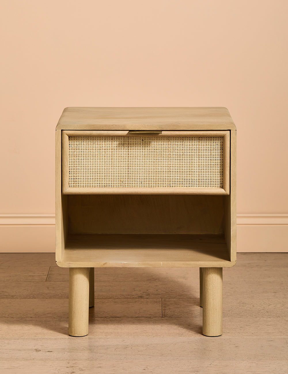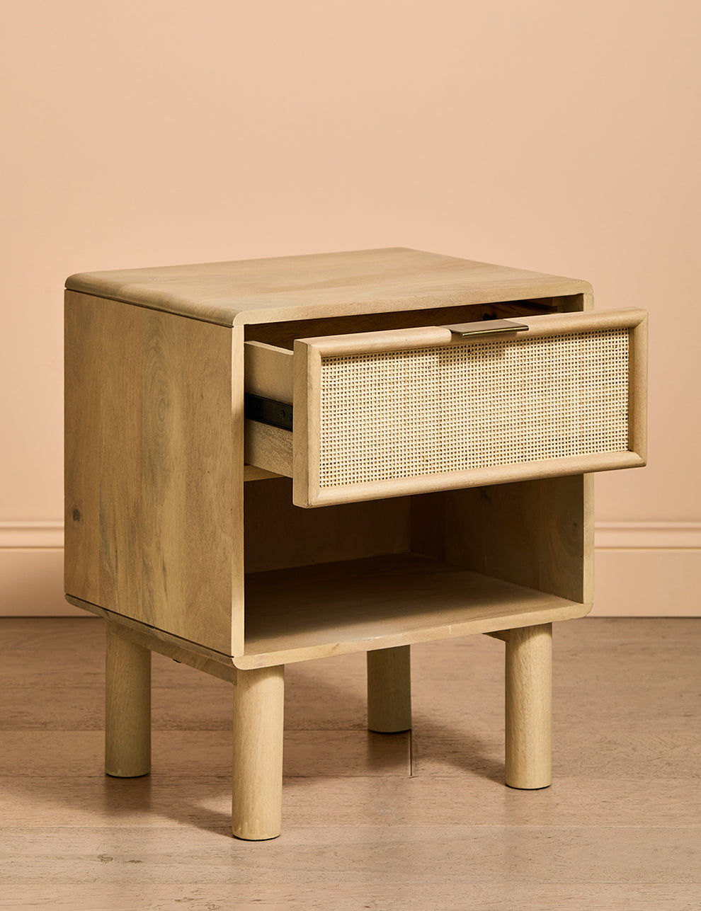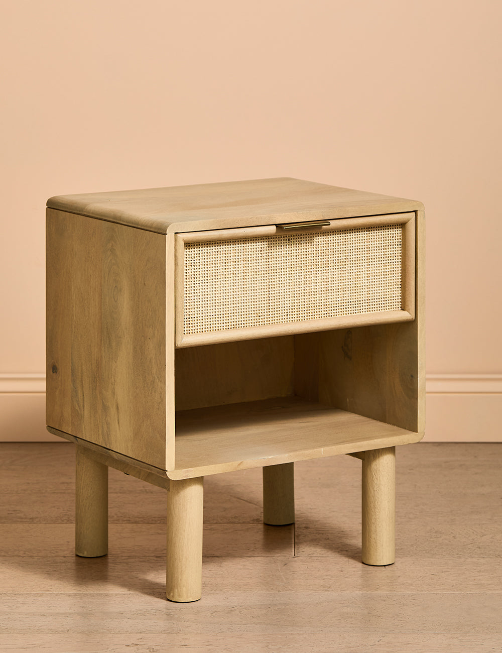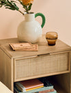 This collection features intricately woven cane set within a modern, minimal mango wood frame - think calm straight lines, perfect proportions and pared back details. We love the (almost) hidden brass handles.