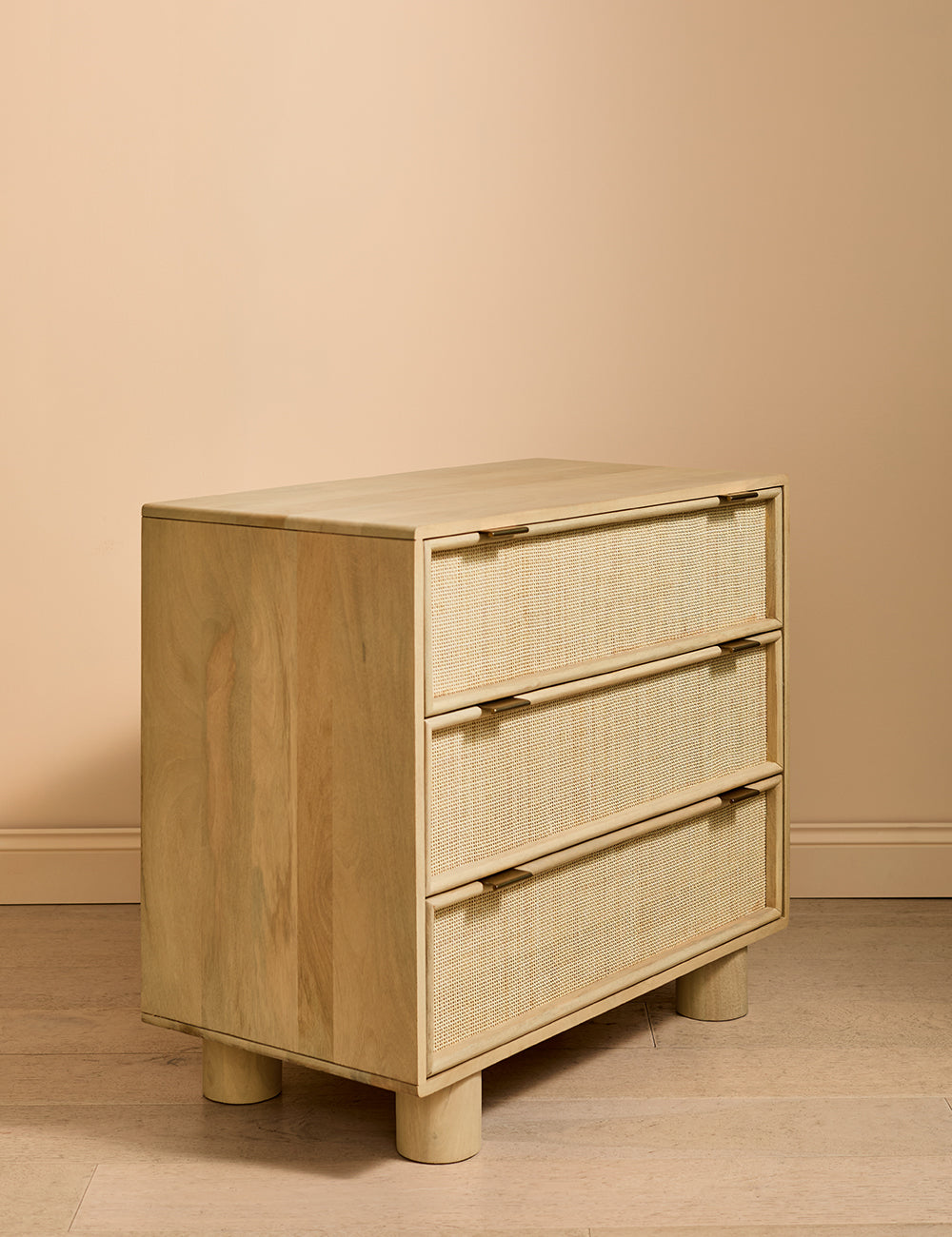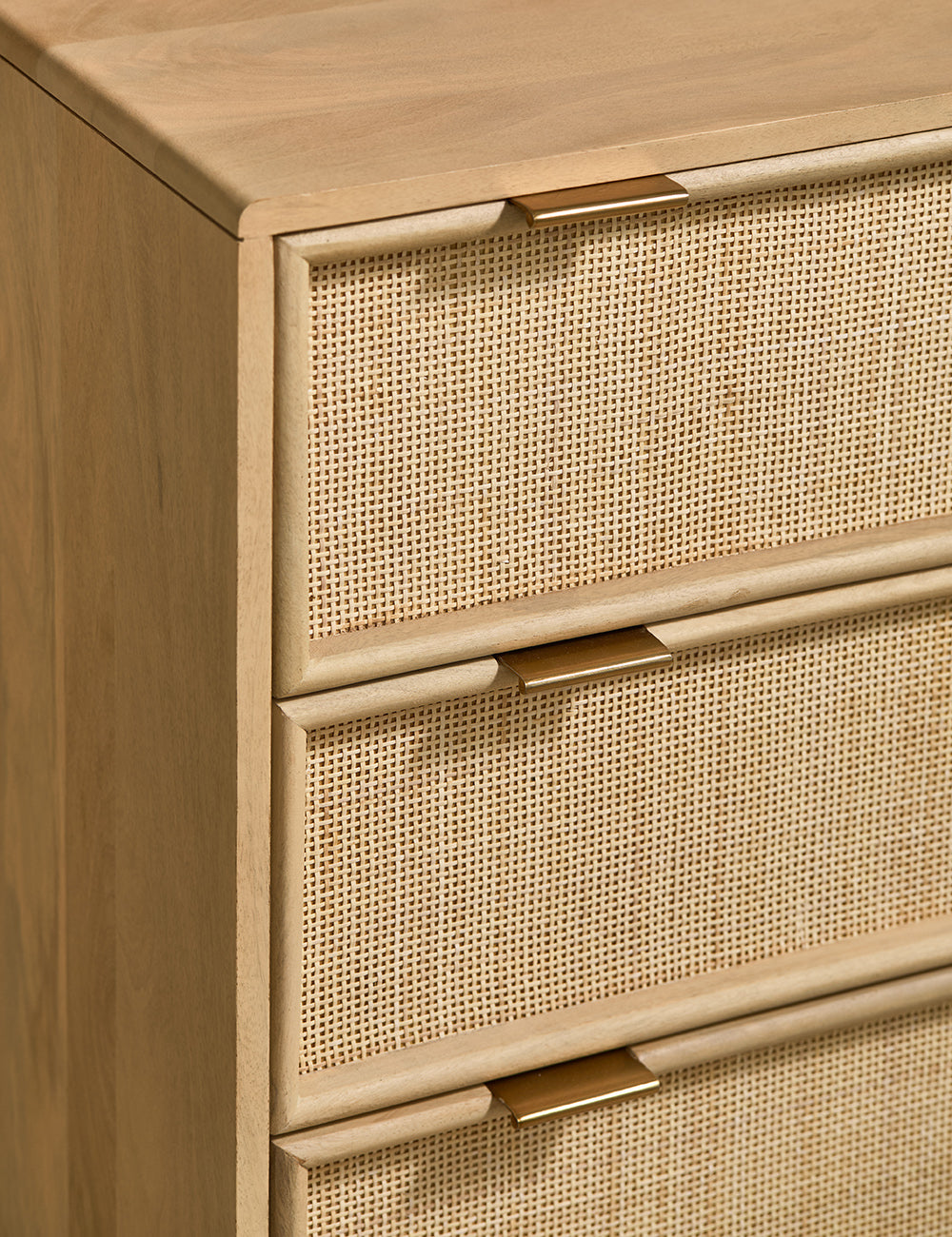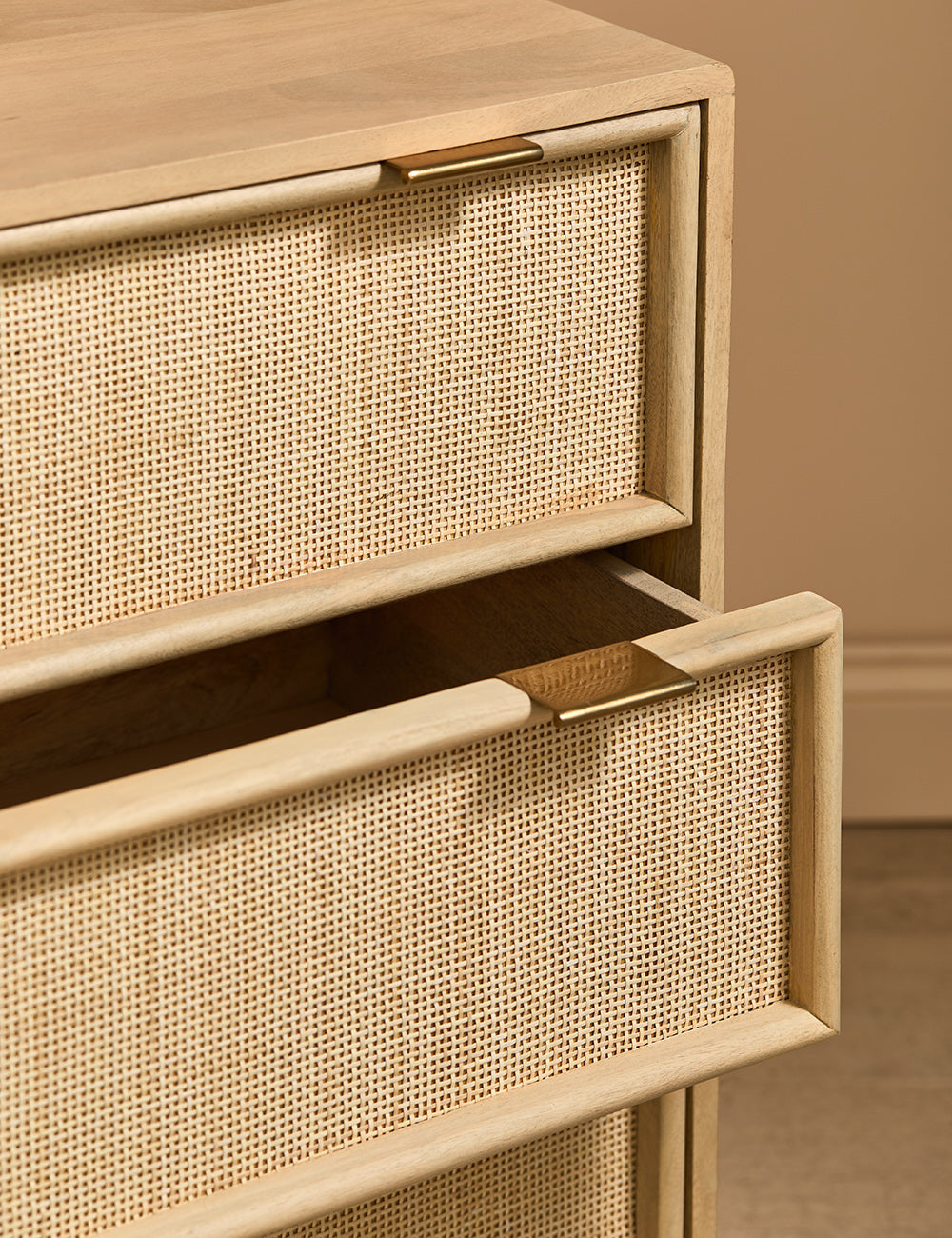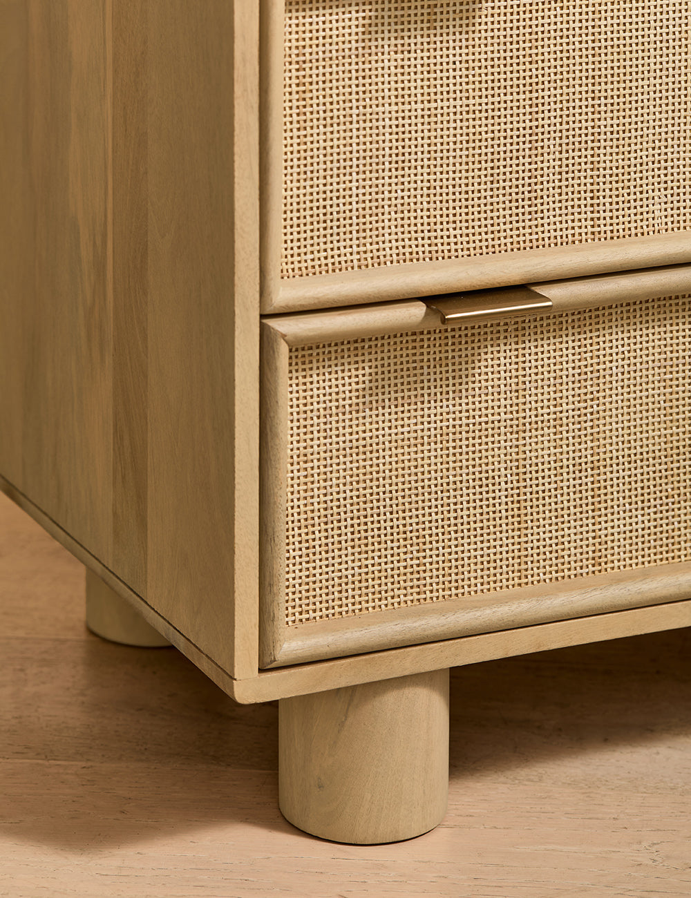 This collection features intricately woven cane set within a modern, minimal mango wood frame - think calm straight lines, perfect proportions and pared back details. We love the (almost) hidden brass handles.