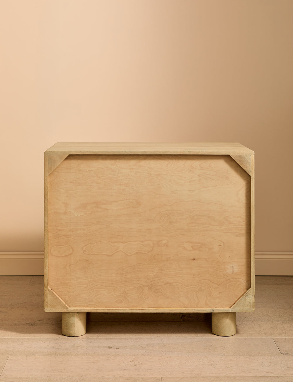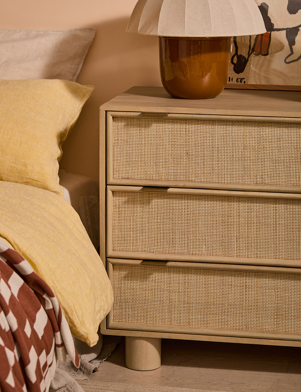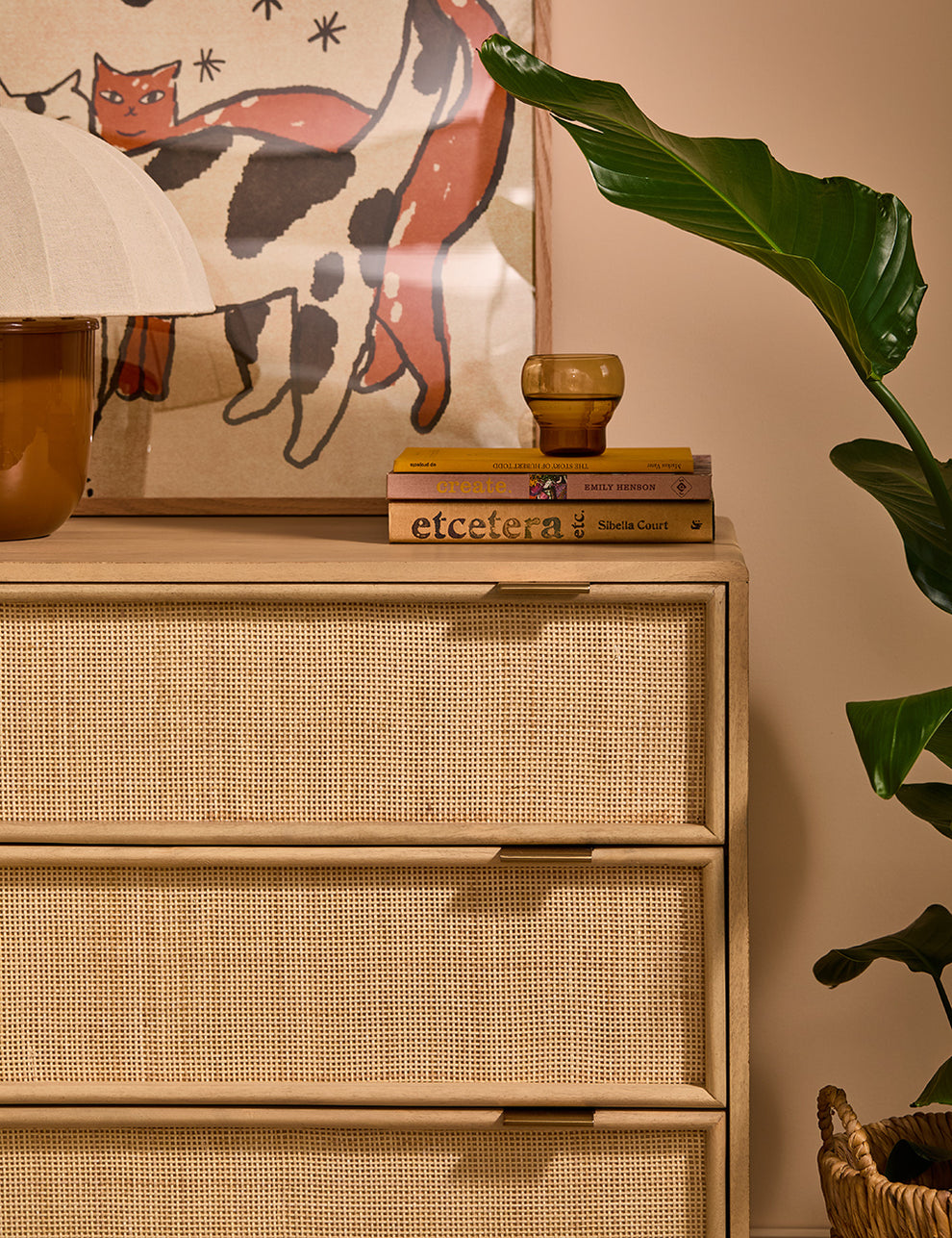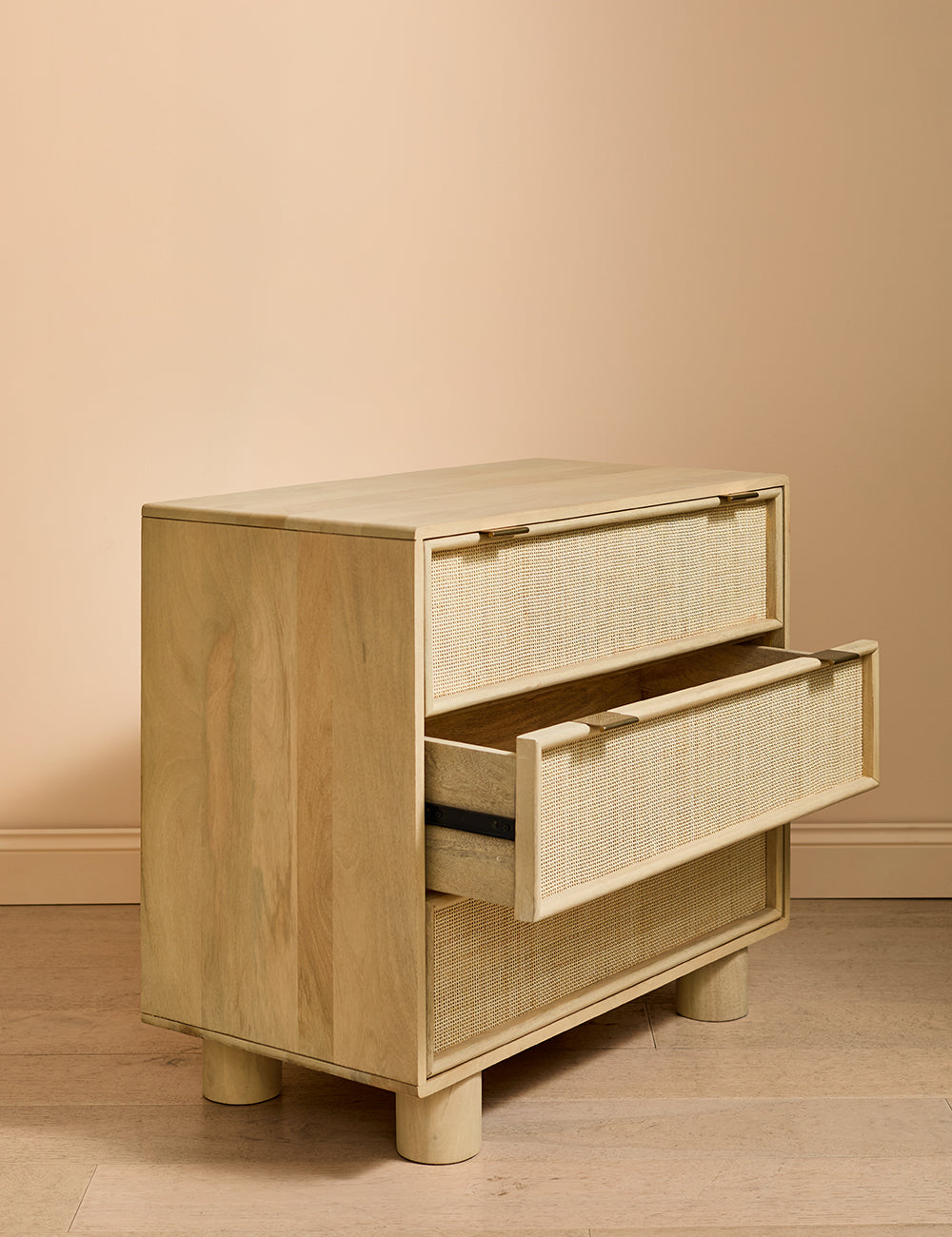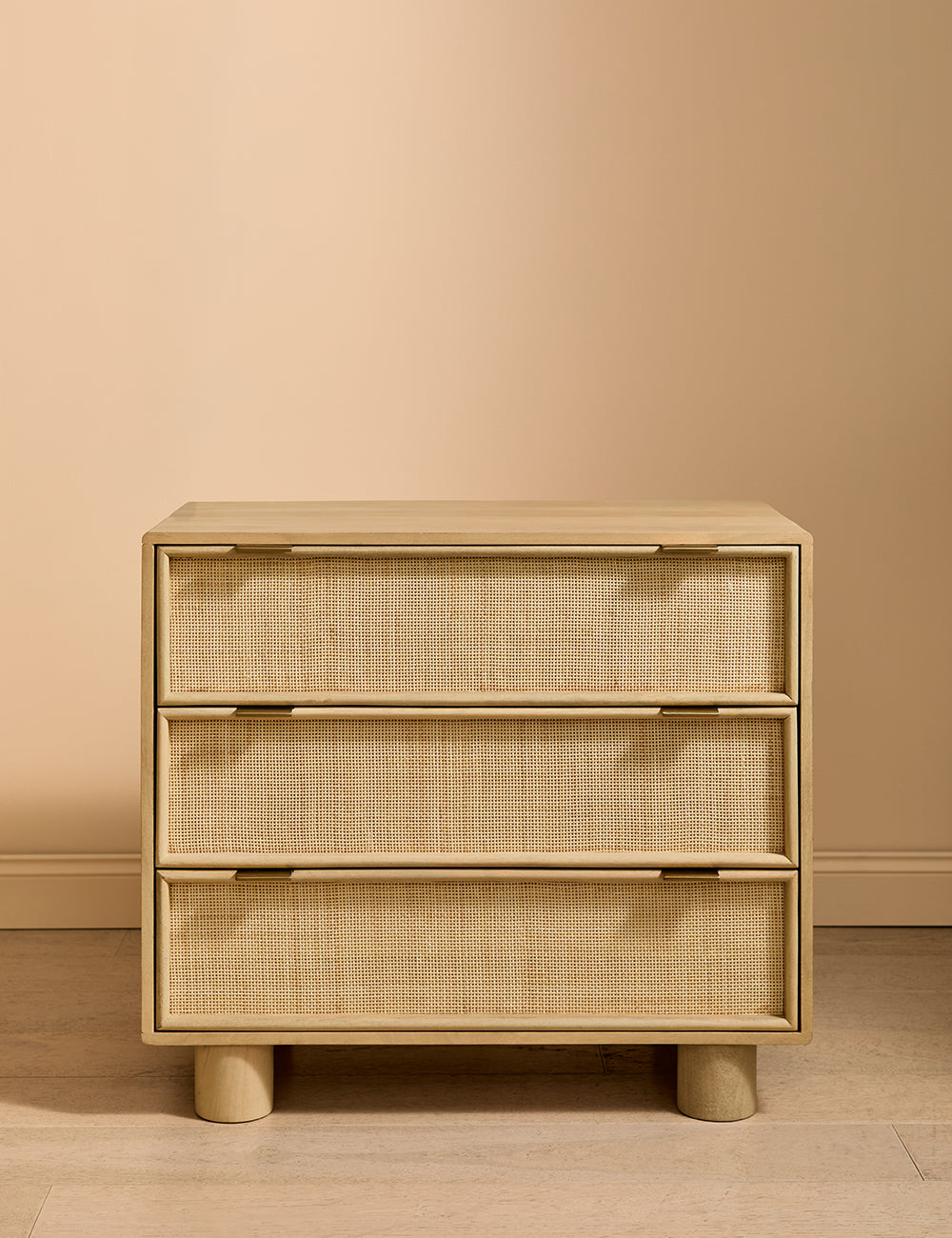 This collection features intricately woven cane set within a modern, minimal mango wood frame - think calm straight lines, perfect proportions and pared back details. We love the (almost) hidden brass handles.