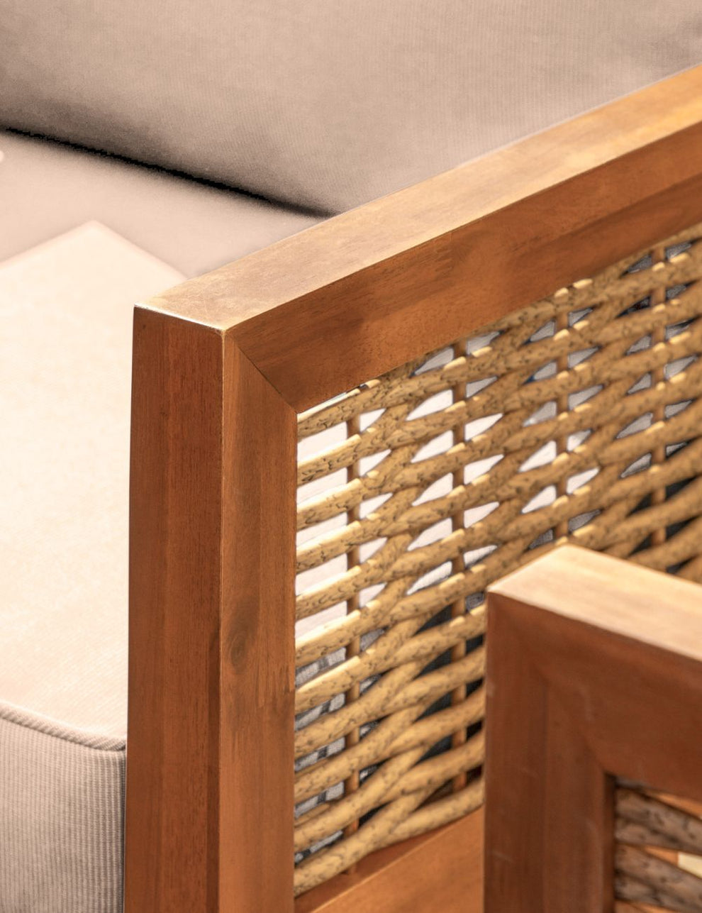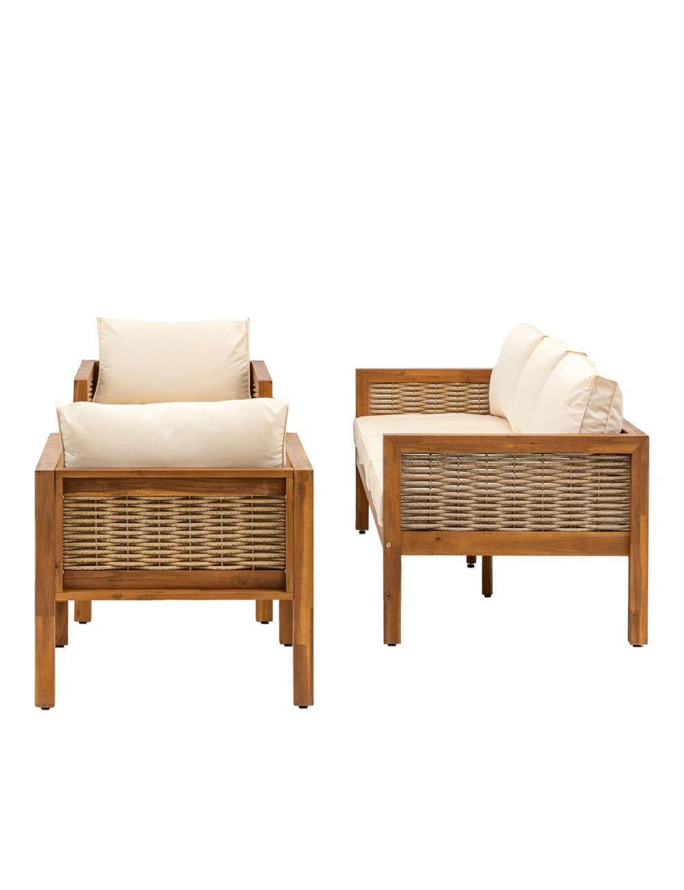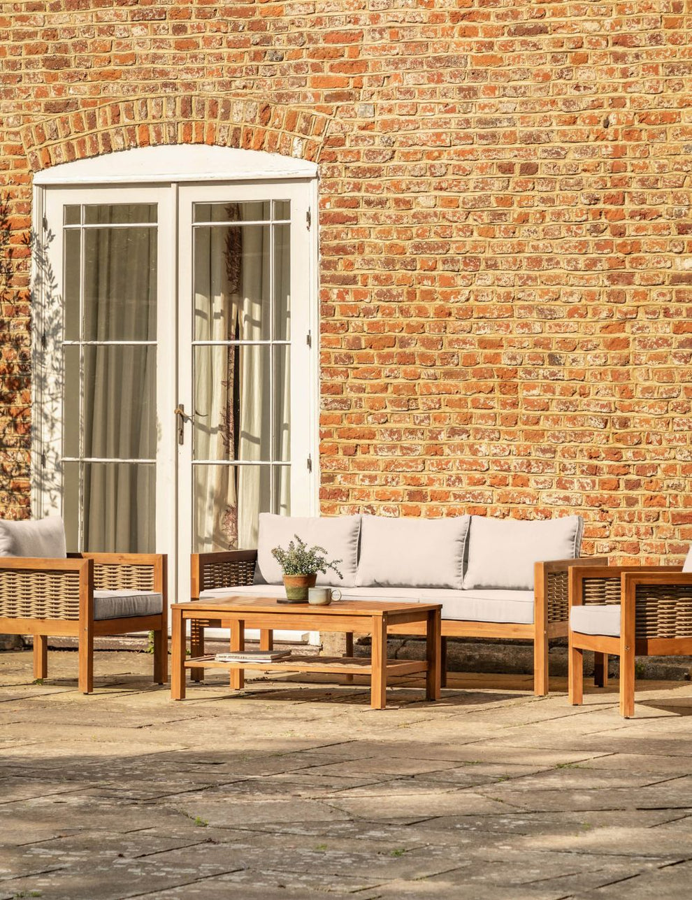Relax outdoors this summer with our 4 Piece Wooden Outdoor Set. The set includes a 3 seater sofa, 2 armchairs and a large coffee table giving you plenty of room for everyone. The elegantly modern design features beautiful Acacia wood finished with woven wicker details on the arms and coffee table, combined with comfortable cushions creating the perfect place to sit and enjoy the summer.