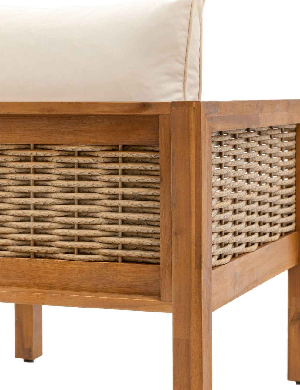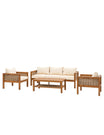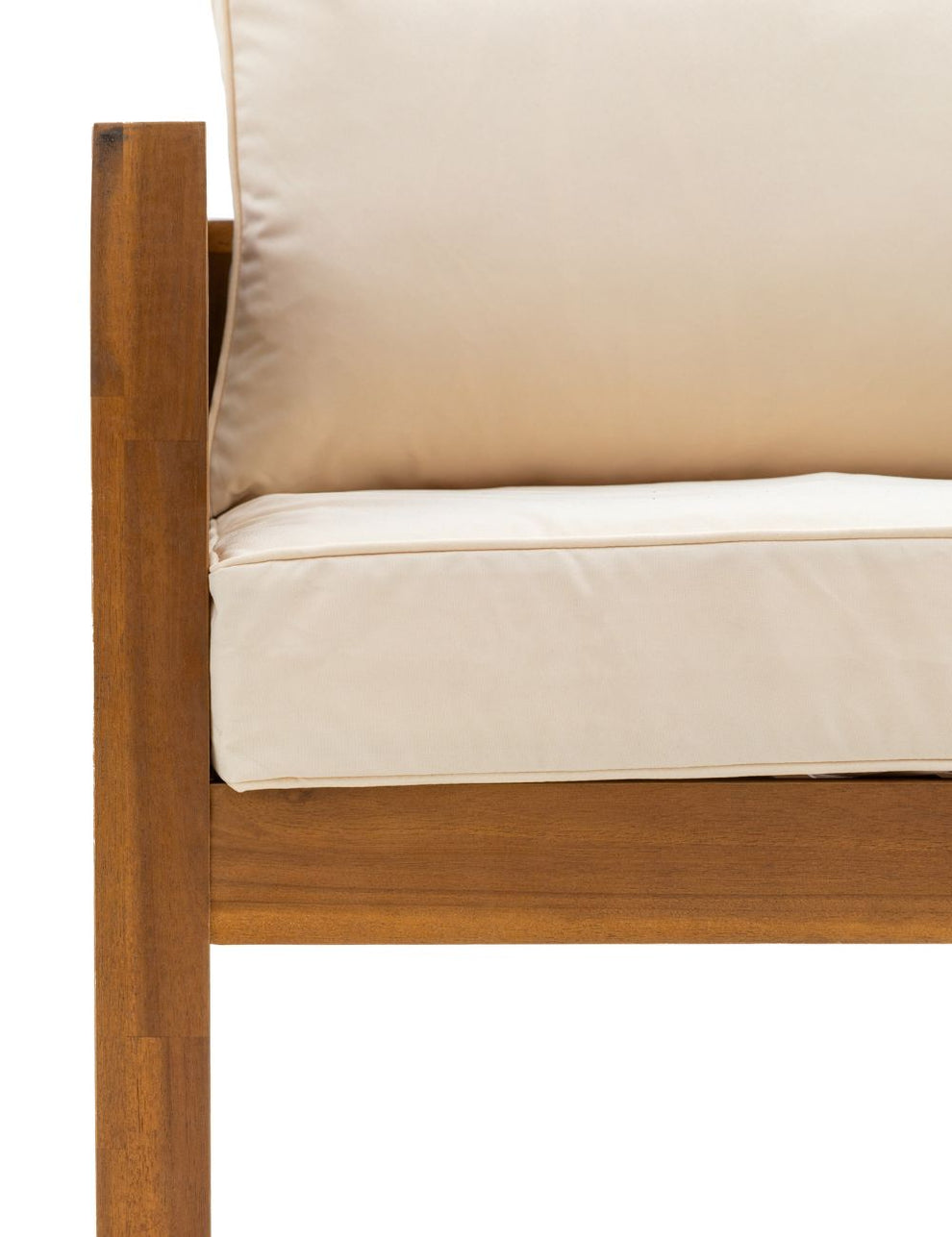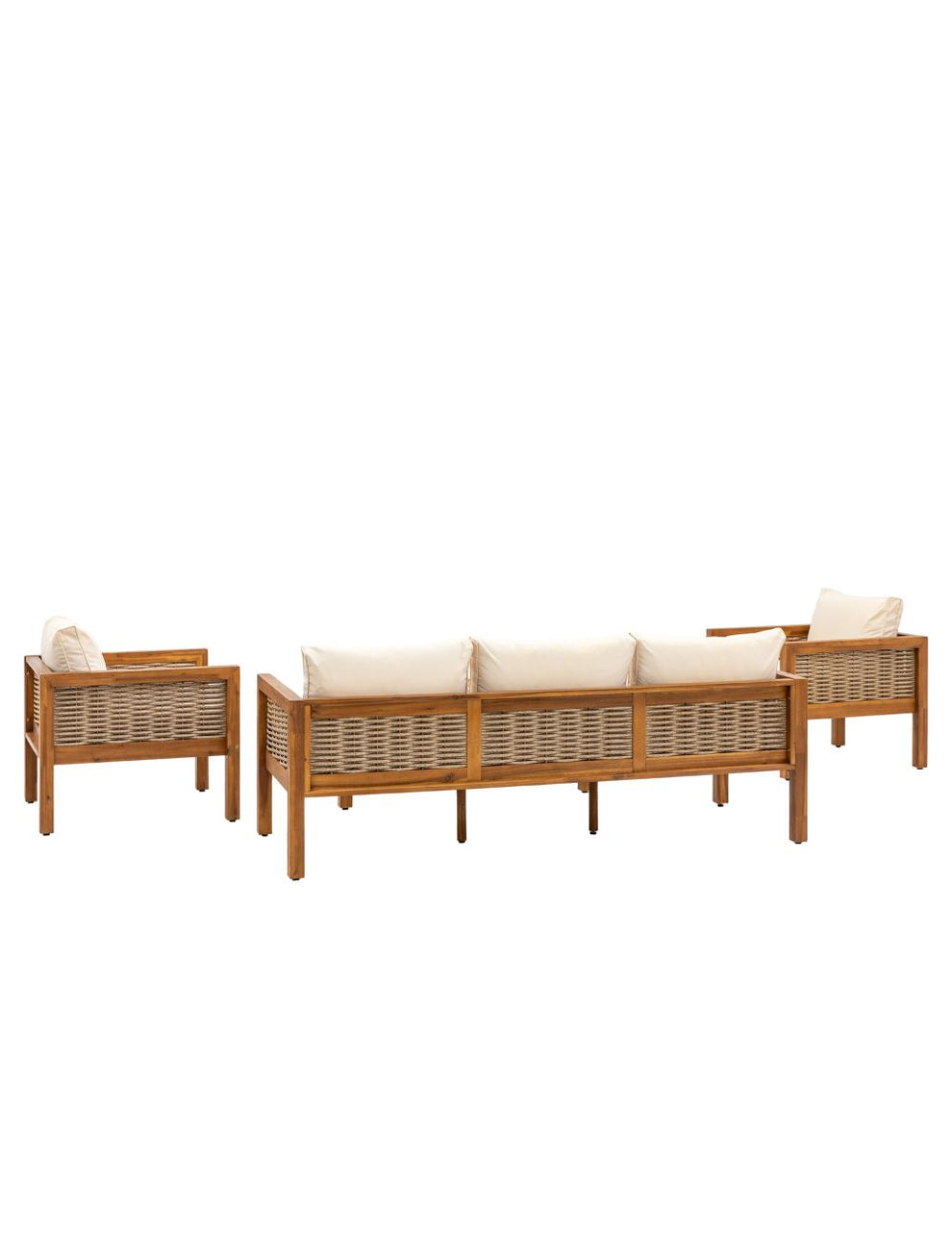Relax outdoors this summer with our 4 Piece Wooden Outdoor Set. The set includes a 3 seater sofa, 2 armchairs and a large coffee table giving you plenty of room for everyone. The elegantly modern design features beautiful Acacia wood finished with woven wicker details on the arms and coffee table, combined with comfortable cushions creating the perfect place to sit and enjoy the summer.