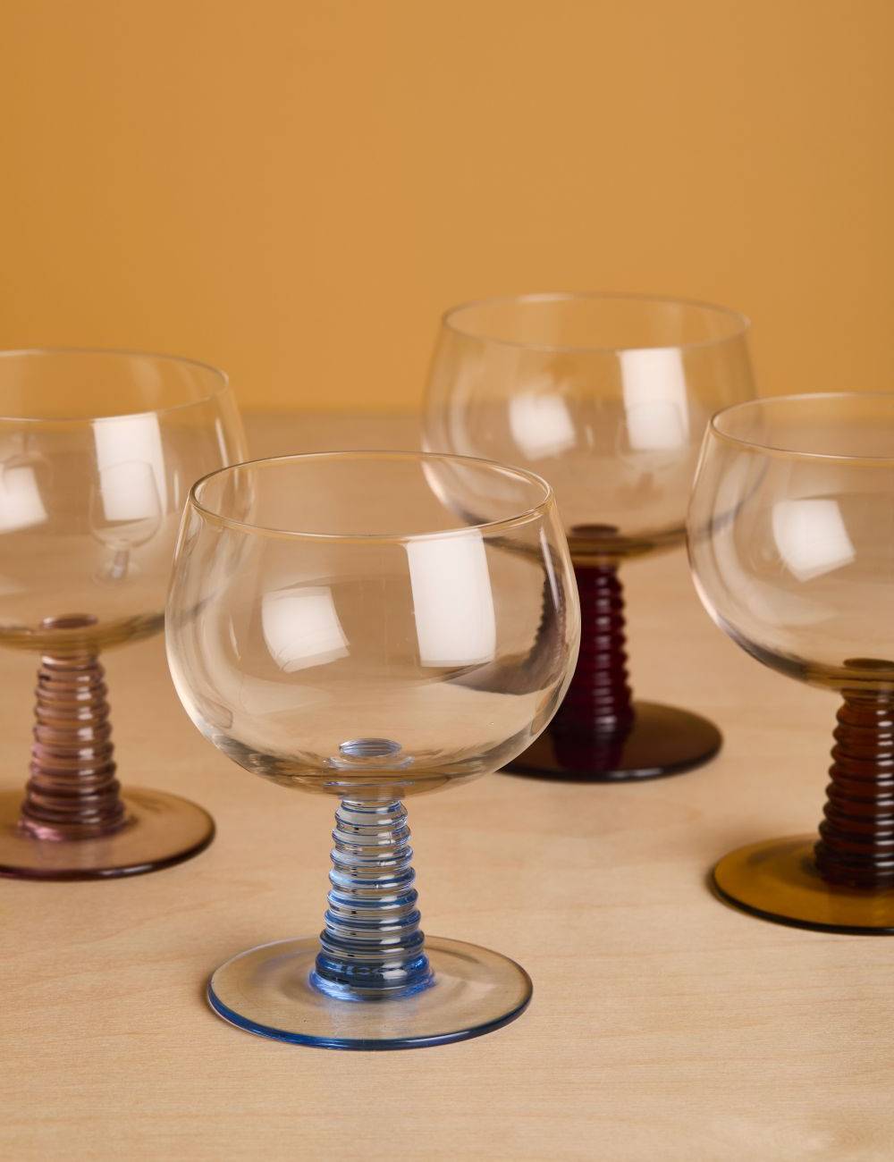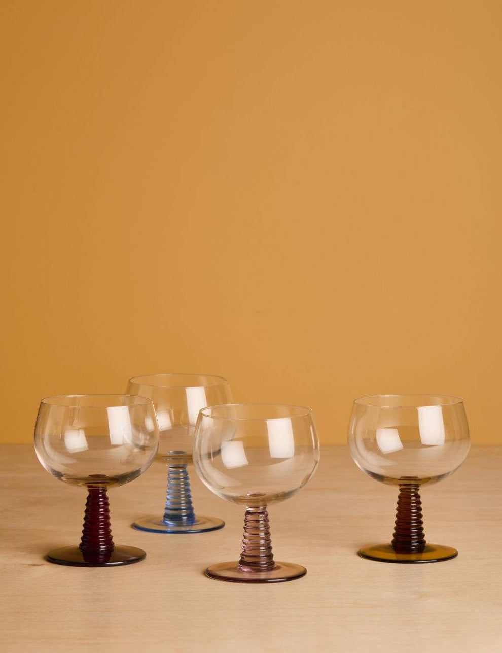 Hand-blown swirl wineglasses with a coloured glass base. Stands out immediately and gives the glass a playful look. This way you can enjoy your wine or another drink even more.