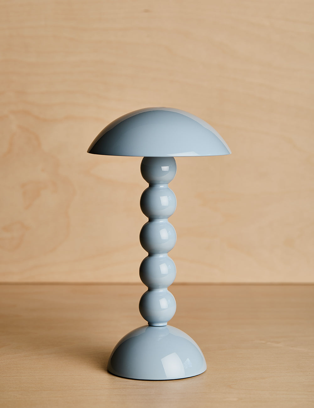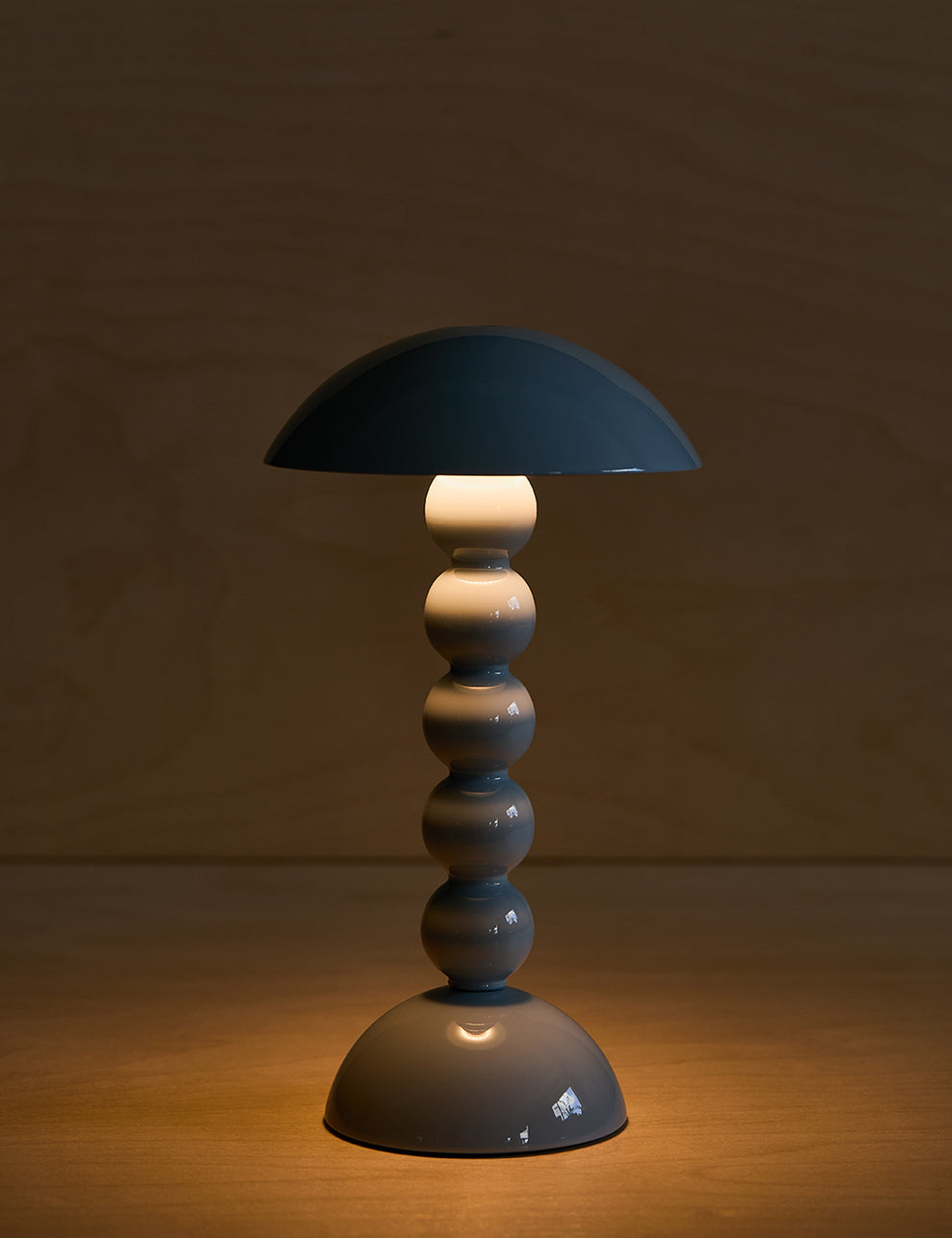 This Pale Denim one-of-a-kind rechargeable lamp features a Bobbin-Shaped design. It offers up to 10 hours of battery life on its brightest setting and has three adjustable light levels.