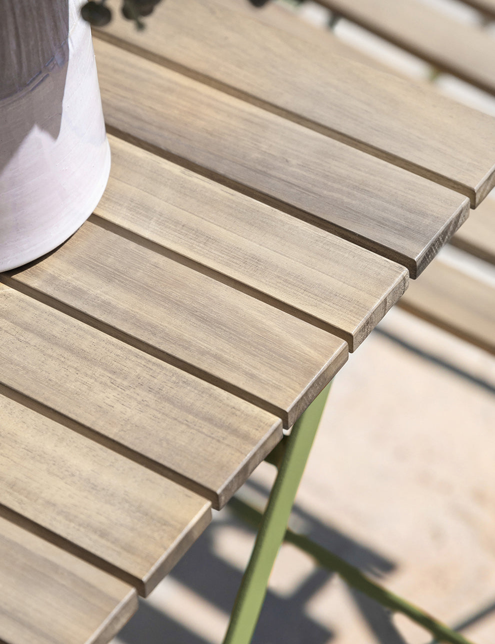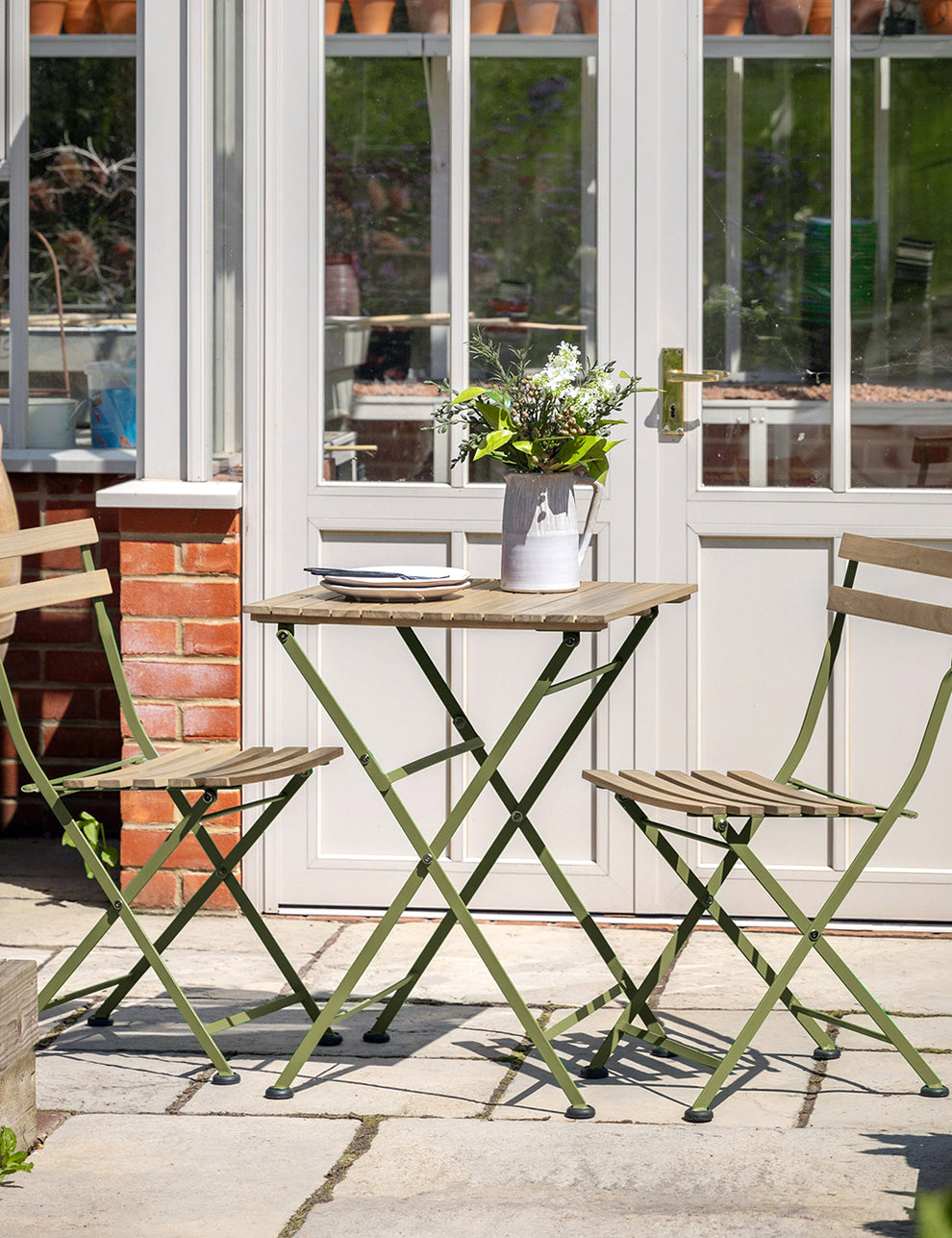 Featuring a slatted acacia wood table and matching seats, the design is complemented by soft green powder-coated steel frames for a fresh, playful contrast. Lightweight and easy to use, each piece folds away neatly for simple storage or transport, making it ideal for flexible outdoor living. A compact yet eye-catching set, perfect for morning coffee or relaxed alfresco moments.