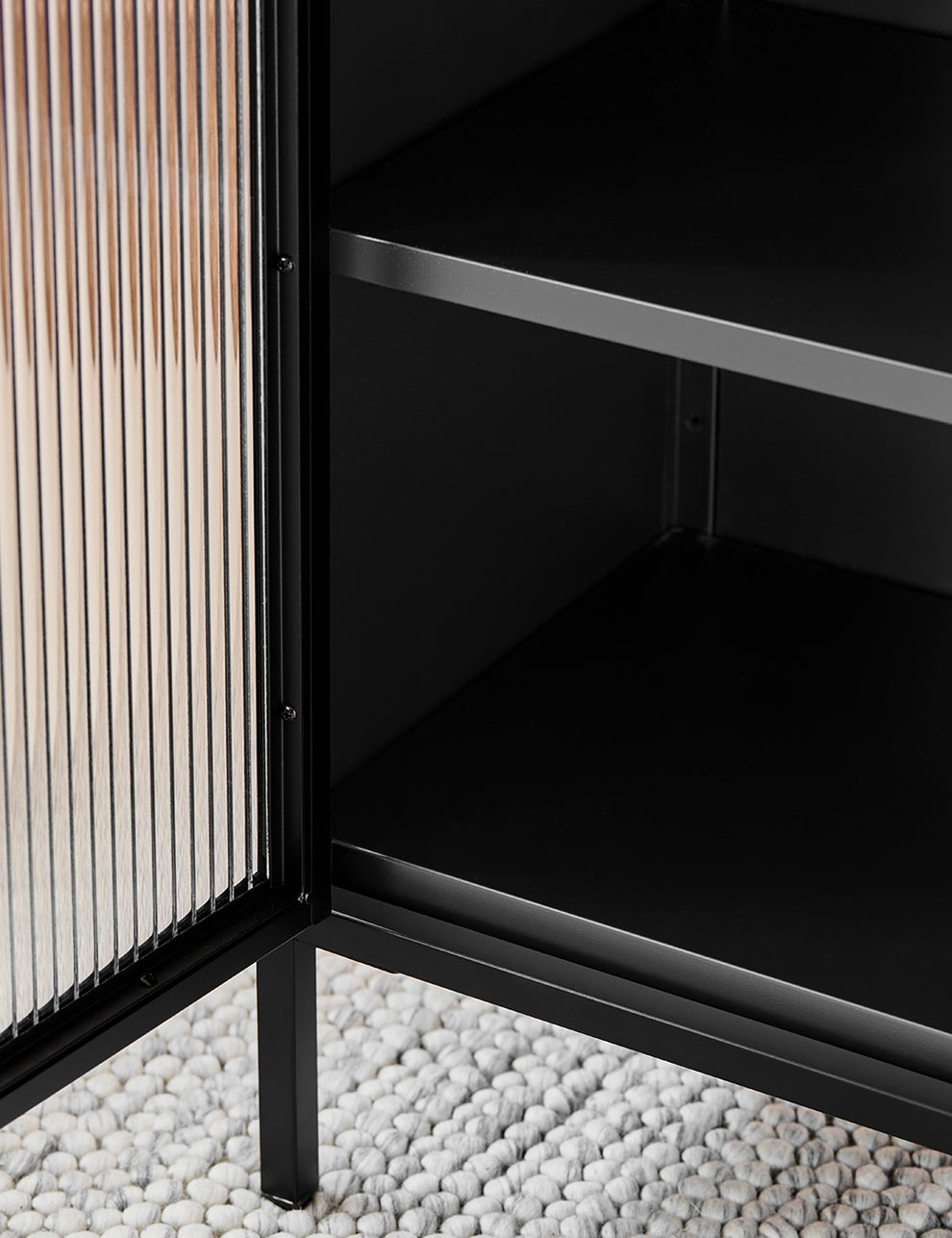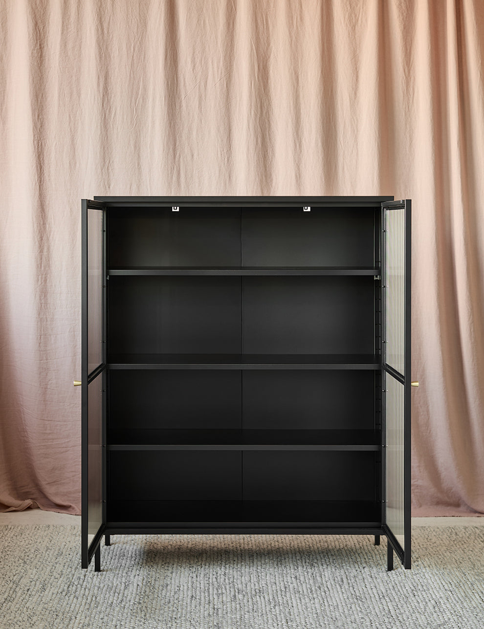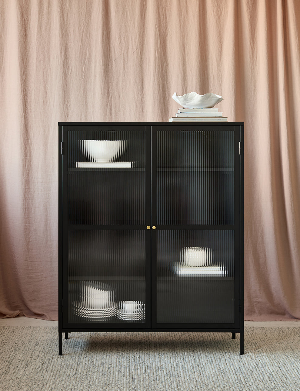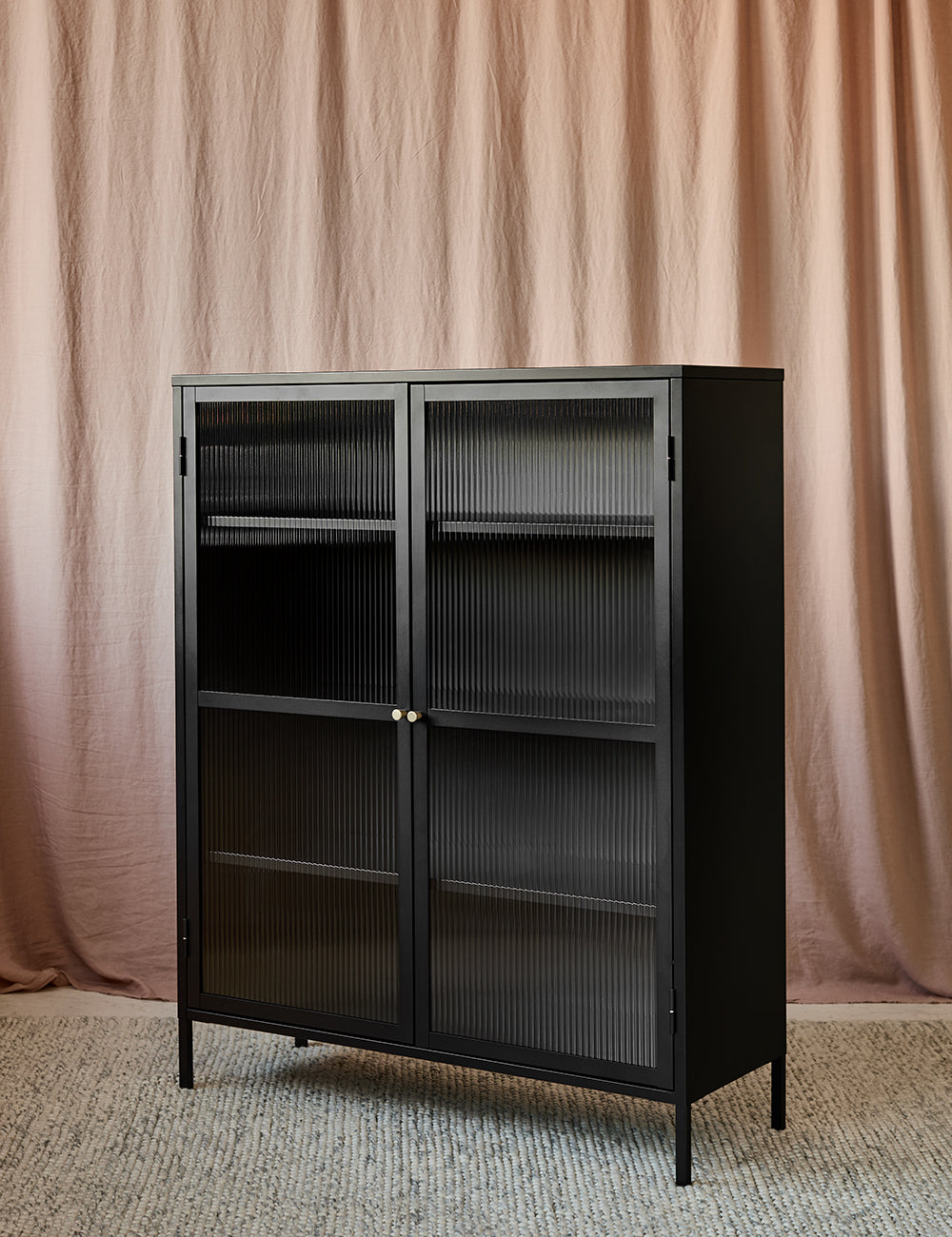 With reeded glass doors, a slim metal profile and minimalist brass handles, this cabinet embodies everything a modern classic piece needs. In an on-trend (but never out of fashion) painted finish, it's 4 shelves (including the cabinet base) will happily hold anything from your favourite crockery and books to toiletries or even clothes. This is a self build piece - all the easier to get into the house!