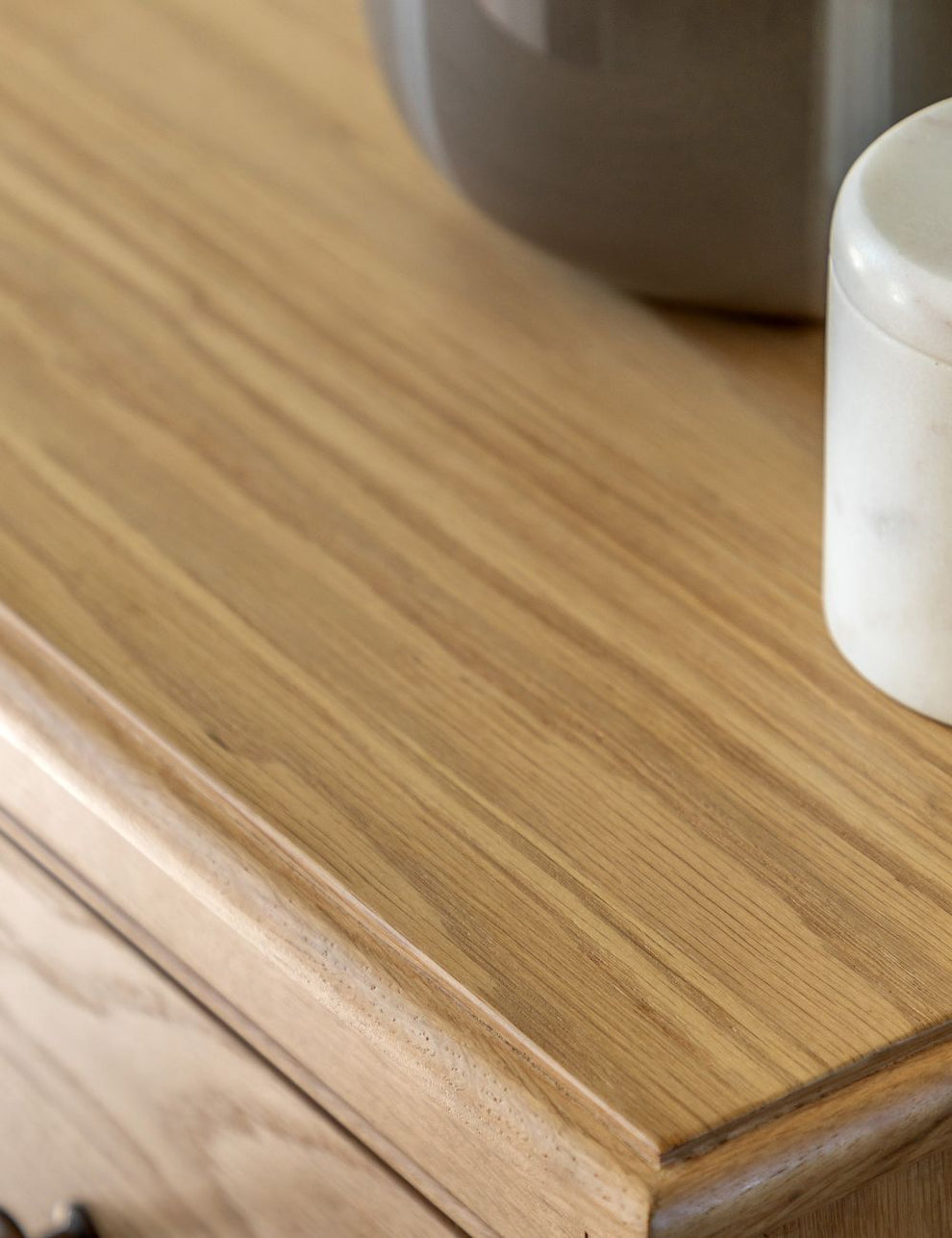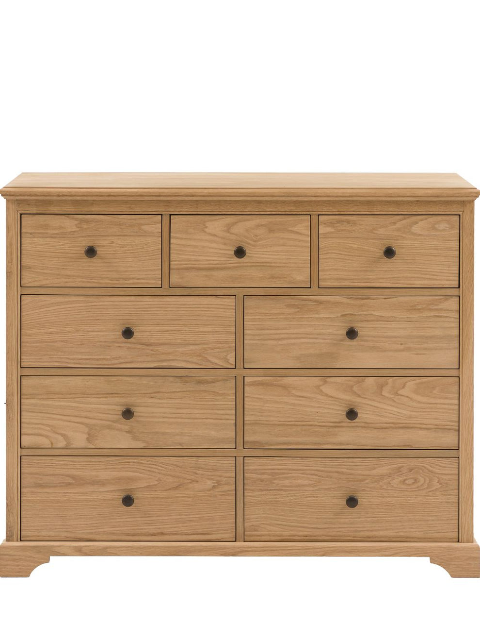 This generously sized wooden chest of drawers offers plenty of storage while bringing a calm, classic feel to the room. With nine drawers in total, including three smaller top drawers, there’s space to keep everything neatly organised and close to hand. Crafted from high-quality solid oak and oak veneers, the warm natural finish highlights the rich grain of the wood, making it easy to pair with a wide range of interiors. Finished with traditional dark knobs, this chest combines timeless style with everyday practicality, making it a useful and lovely addition to any space.