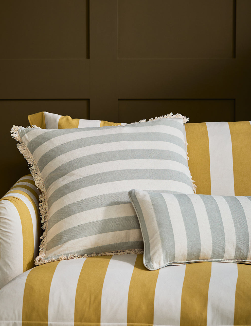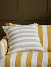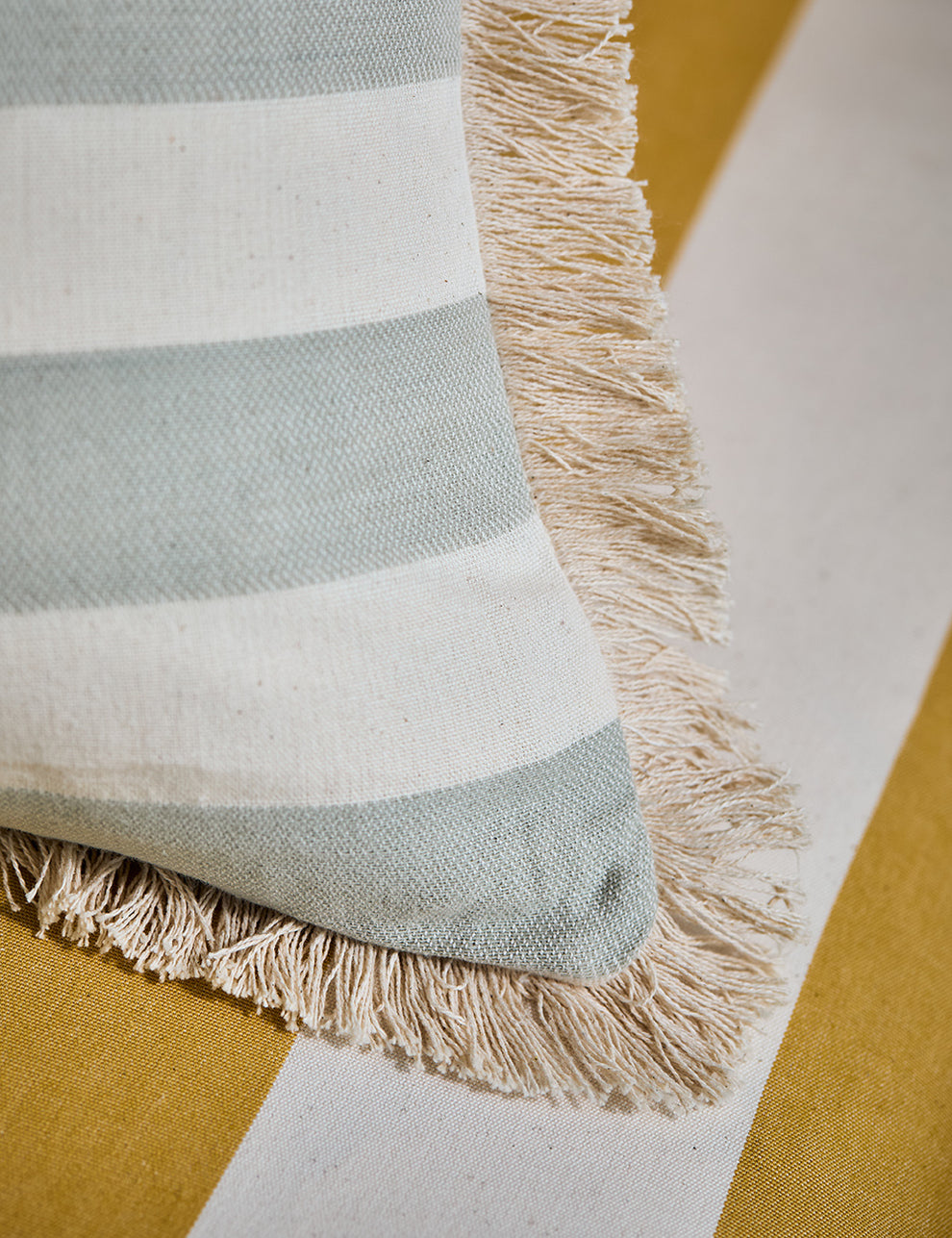 A bold stripe cushion with a wide stripe pattern and soft fringe edge. This cushion is generously sized, giving it that perfect amount of squish. Made from recycled cotton, the fabric is soft and of lovely quality. As happy on a sofa as on a bed. Also comes in a rectangle shape.