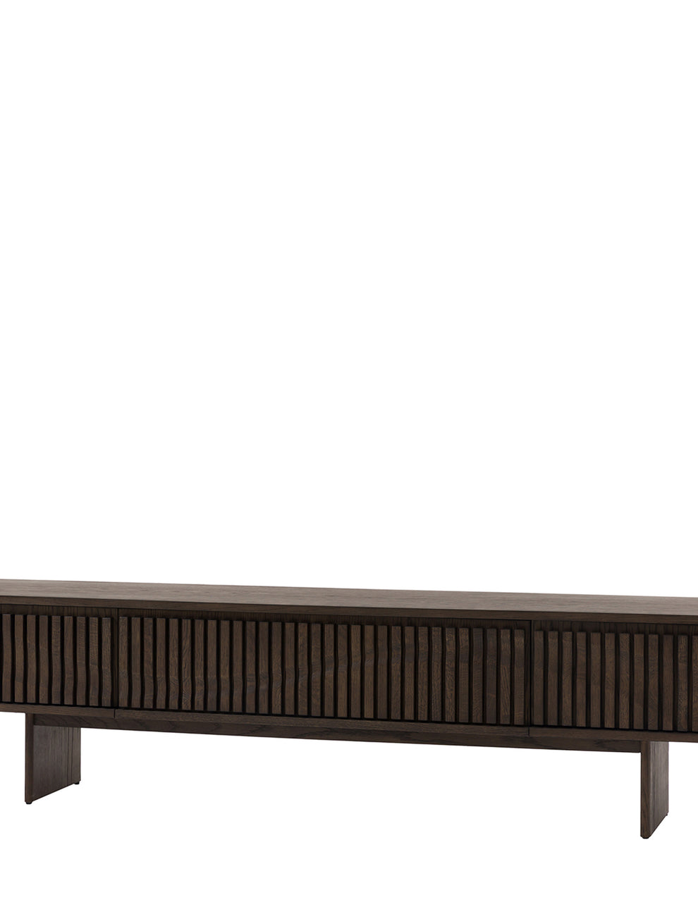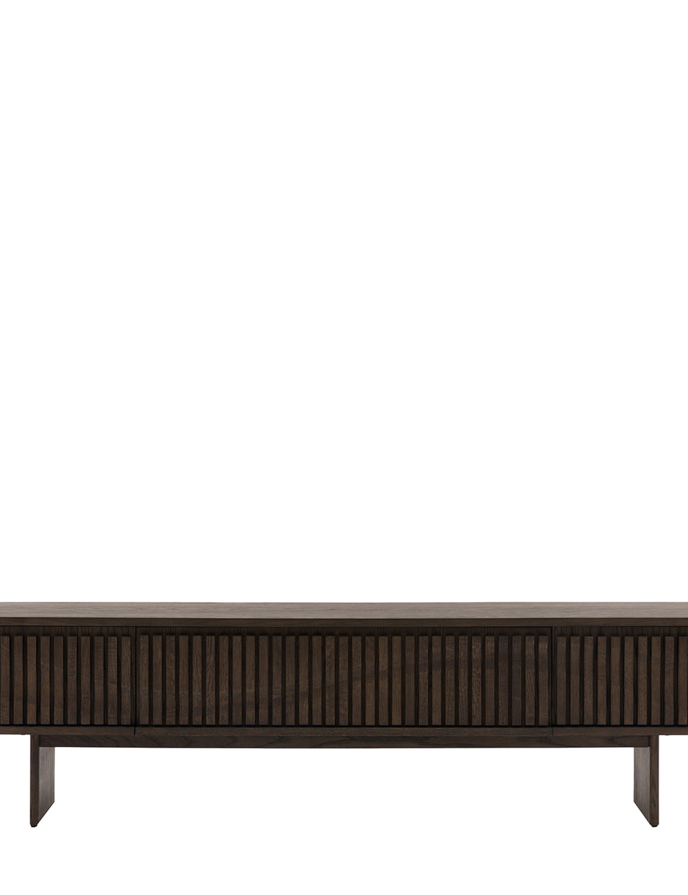 Effortlessly stylish with a nod to modern Italian design, this media unit brings a refined, contemporary feel to any living space. Crafted from oak solids and veneers in a rich charcoal-brown finish, it showcases clean lines alongside beautifully detailed slatted wave cupboard doors for added texture and interest. Offering ample storage for media and electronics, it seamlessly combines practical functionality with elevated design.