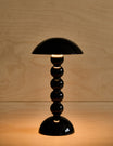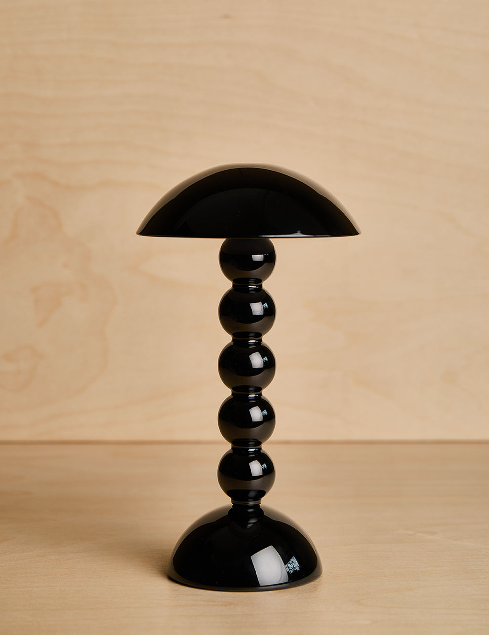 This Black one-of-a-kind rechargeable lamp features a Bobbin-Shaped design. It offers up to 10 hours of battery life on its brightest setting and has three adjustable light levels.